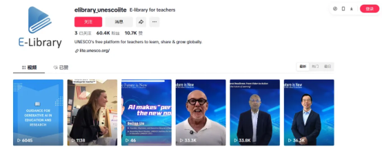 在推广方面,“教师电子图书馆”项目积极拓展社交媒体渠道,已陆续在TikTok、俄罗斯社交网络Vkontakte等建立官方账号,并建立官方论坛E-Tech。其中,TikTok账号上线仅五个月,便吸引了超过6万名粉丝,视频播放量突破100万次。由UNESCO IITE所长展涛发起的AI专家系列活动,围绕人工智能政策、工具及最佳实践制作系列短视频,吸引了不少全球年轻教育工作者的关注。